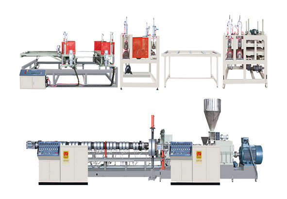 金象改進(jìn)型擠塑板生產(chǎn)線,第一組機組采用平行雙螺桿擠出機,雙螺桿擠出機特有的結(jié)構(gòu),將原料充分混合,螺桿轉(zhuǎn)速高,物料停留時間短。